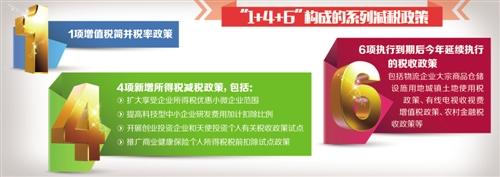 据悉,“1”是1项增值税简并税率政策。“4”是4项新增所得税减税政策,包括扩大享受企业所得税优惠小微企业范围、提高科技型中小企业研发费用加计扣除比例、开展创业投资企业和天使投资个人有关税收政策试点、推广商业健康保险个人所得税税前扣除试点政策等。“6”是指6项执行到期后今年延续执行的税收政策,包括物流企业大宗商品仓储设施用地城镇土地使用税政策、有线电视收视费增值税政策、农村金融税收政策等。