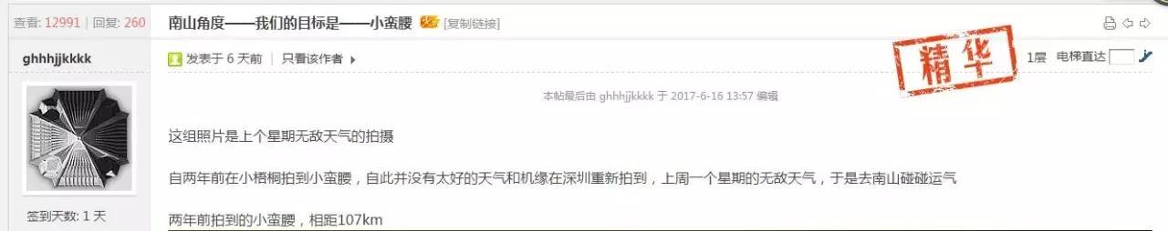 不管你信不信,反正已经有人做到了。最近在高楼迷论坛上有一个帖子很火,帖子标题“南山角度——我们的目标是——小蛮腰”,作者:@ghhhjjkkkk,该帖记录了作者在深圳南山拍摄广州塔的全过程。