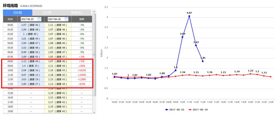 本周日(6月25日)车流量8点至13点环比上周日(6月18日)大幅增长,10、11点达到峰值,高德拥堵延时指数达到11.54,环比增长886%,属于严重拥堵,行驶车速仅4Km/h。