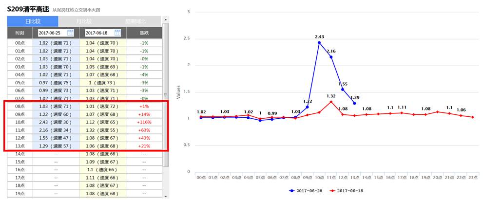 其中6月25日(周日)环观南路拥堵持续时长达到106分钟,拥堵长度1.2Km以上,S209清平高速拥堵持续时长达到 176分钟,拥堵长度2.3Km以上。