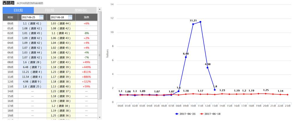 本周日(6月25日)车流量8点至13点环比上周日(6月18日)大幅增长,10、11点达到峰值,高德拥堵延时指数达到11.54,环比增长886%,属于严重拥堵,行驶车速仅4Km/h。