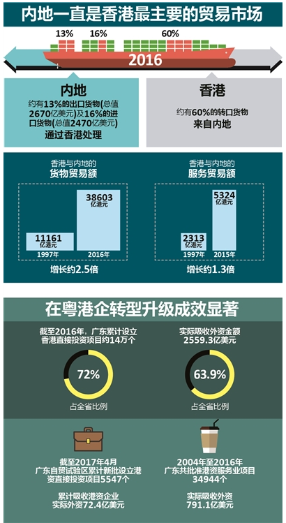 提及粤港合作,人们首先想到的,就是长期活跃在广东全省的大批港资企业。据介绍,截至2016年底,广东累计设立香港直接投资项目约14万个,实际吸收外资金额2559.3亿美元,分别占全省的72%和63.9%。