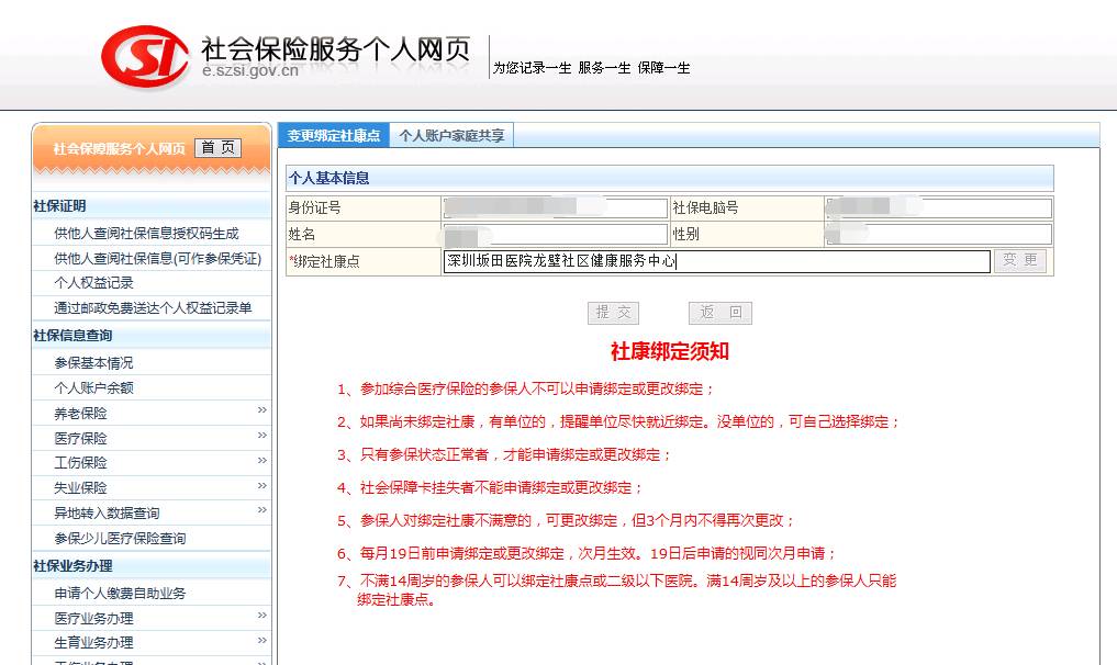 查询、绑定、更改绑定方法:深圳人力资源和社会保障局官网(http://www.szhrss.gov.cn/)→→选择社会保险个人网上服务→→登录进入→→左边医疗业务办理中的“变更绑定社康点”。