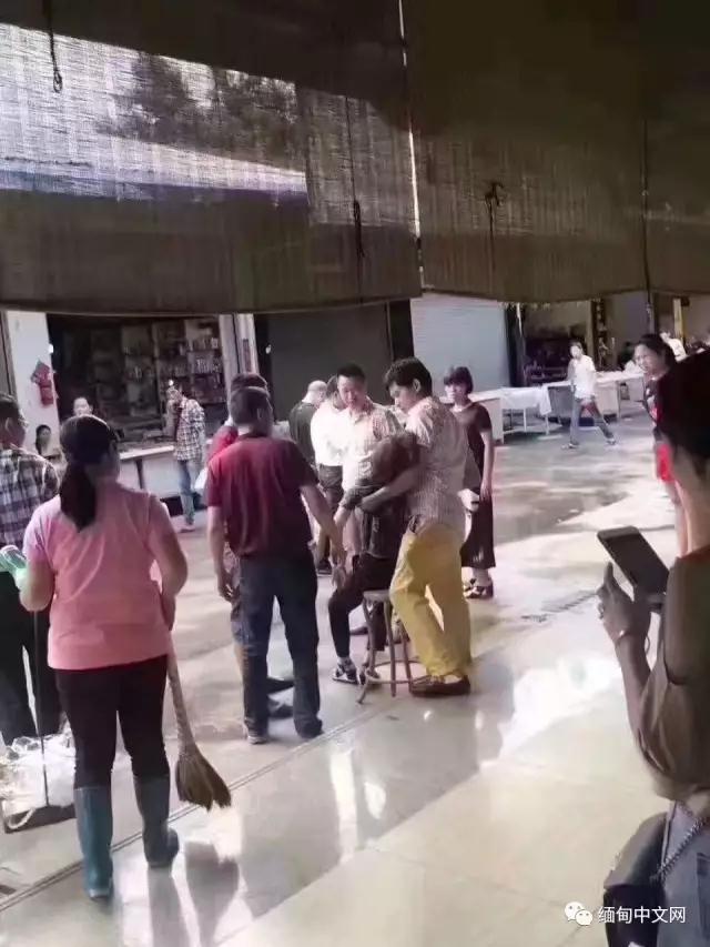 根据德宏广播电视台的报道,这名女游客来自江西,她从手上取玉镯的时候,“左边夹着包,右边夹着雨伞,取下来的时候,手镯啪啦就掉到地上了。”图为周围人将女子抬到室外进行救治。