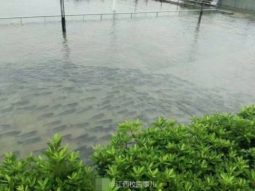 6月26日报道,近日,南昌大学正气广场河边由于雨天涨水,把昔日的广场路淹没,鱼竟然浮游到岸边。图文:江西校园事儿