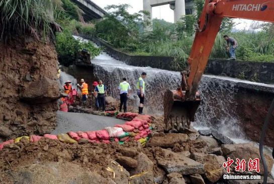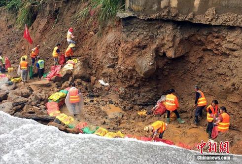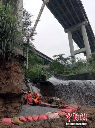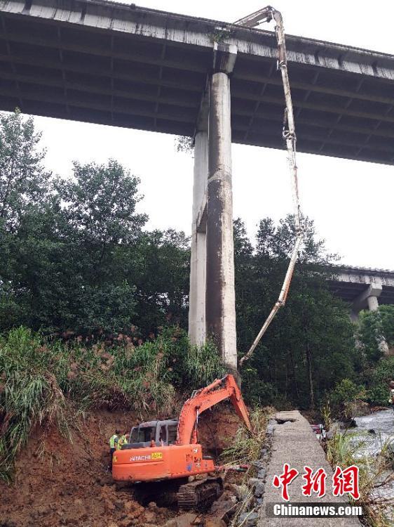 6月25日晚,江西省高速集团南昌西管理中心发现,位于大广高速江西宜丰县境内的电站大桥受洪水冲刷,致使5号桥墩部分桩基裸露。26日凌晨,南昌西管理中心连夜调集挖掘机、沙袋等设备和应急物资抵达现场,并开展排水工作。为确保桩基牢固,养护人员调来混凝土泵车,借助输送臂从30多米高的高架桥桥面由上往下浇筑早强混凝土,对桩基进行加固。截至目前,已浇筑混凝土30立方,整个桩基加固预计使用80多立方,采取分层浇筑,预计28日下午全面完成加固工作。欧阳斌 摄
