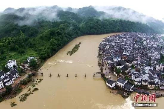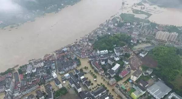 △连日来,浙江兰江水位暴涨,下游的杭州建德大洋集镇变为“水城”。