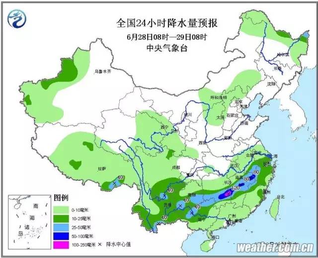 中央气象台28日6时发布暴雨蓝色预警:预计,6月28日8时至29日8时,广西北部和西部、贵州南部、湖南中南部、江西中部和东北部、福建西北部、浙江西部、安徽南部、云南南部等地有大到暴雨,局地有大暴雨(100~120毫米);上述部分地区有短时强降水、局地伴有雷暴大风等强对流天气,最大小时雨强30~50毫米,局地可超过60毫米。