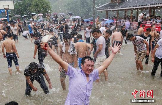 6月29日,农历六月初六,广西柳州市融安县长安镇大袍屯苗族村寨举行“闹鱼节”活动。当地苗族群众和壮族、侗族等民族同胞一起吹奏芦笙、跳踩堂舞,在水中闹鱼、抓活鱼,庆祝丰收。据了解,该节日是苗族群众预祝丰收的传统节日。谭凯兴 摄
