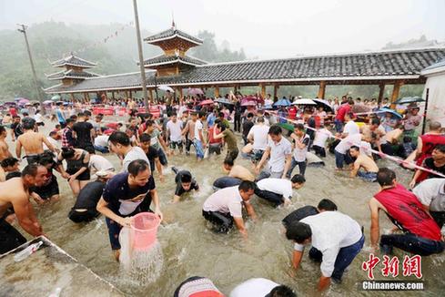 游客在大袍屯苗族村寨举行六月六“闹鱼节”活动中抓鱼。 谭凯兴 摄