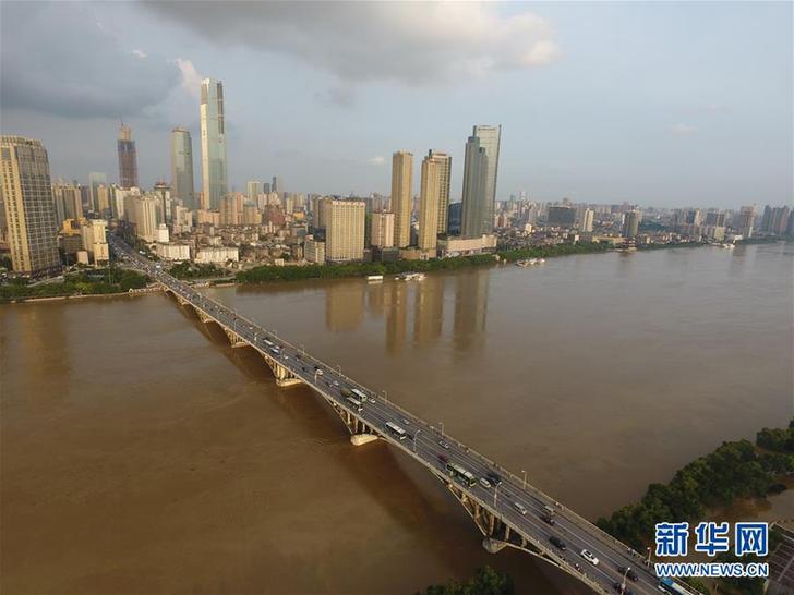 超高水位将长沙橘子洲大桥桥墩几乎淹没(7月2日摄)。7月2日下午,湖南省水文水资源勘测局发布洪水红色预警:受强降雨影响,湘江全线继续上涨,预计未来三天内,湘江干流全线将出现接近和超过历史最高水位的洪水。新华社记者龙弘涛 摄