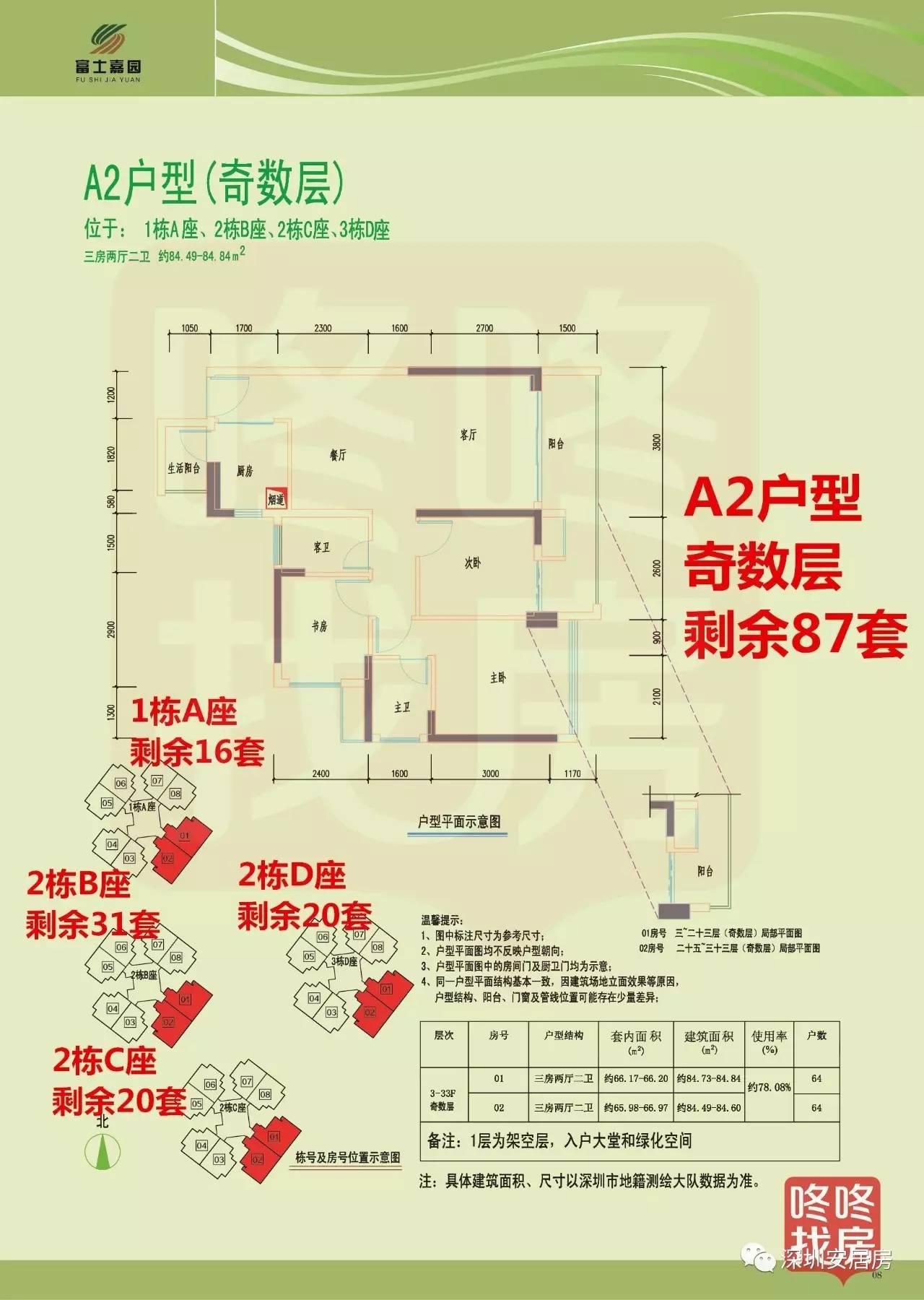 A2户型(奇数层)为三房两厅两卫,84-85平米,共剩余87套。其中,1栋A座剩余16套,2栋B座剩余31套,2栋C座剩余20套,3栋D座剩余20套。