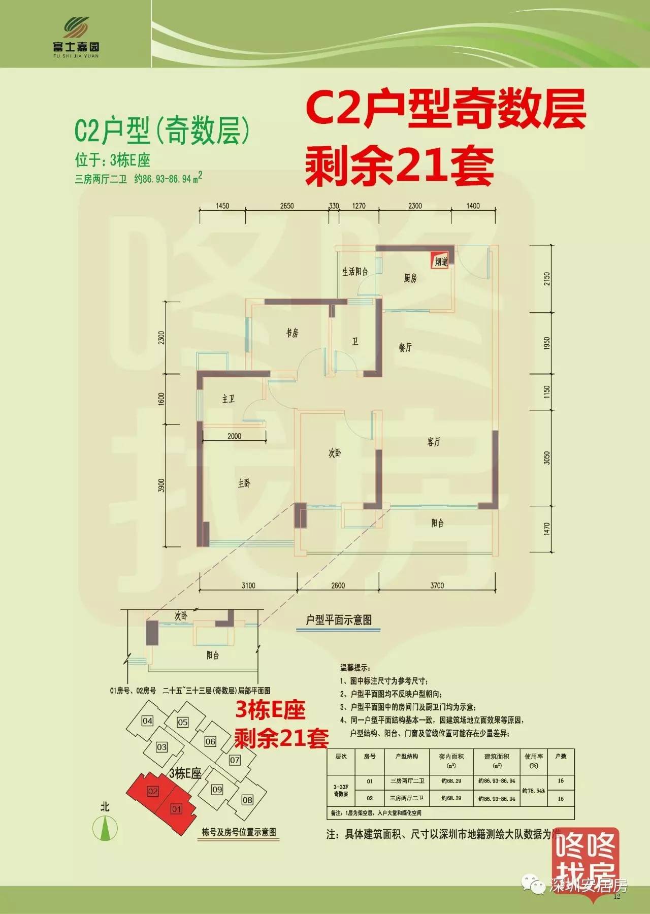 C2户型(奇数层)为三房两厅两卫,86平米左右,共剩余21套,同样位于3栋E座。
