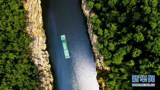 巫山小三峡的滴翠峡内,一艘游船满载着游客在美丽的山水间前行(6月29日摄)。新华社记者 刘潺 摄