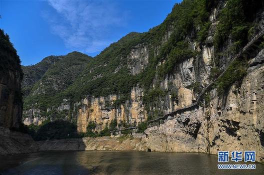 巫山小三峡的滴翠峡内,两岸的青山和绝壁上的仿古栈道相映成趣(6月29日摄)。新华社记者 刘潺 摄