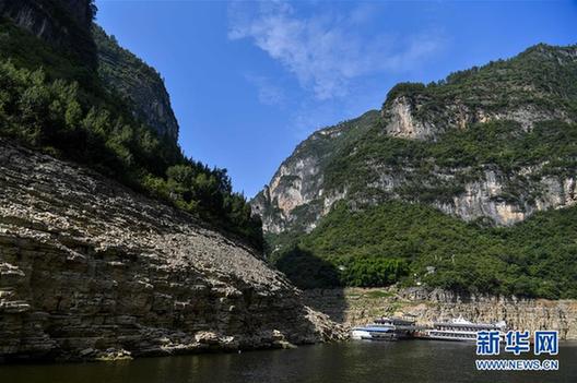巫山小三峡的滴翠峡内,一艘游船载着旅客停靠在入口处(6月29日摄)。新华社记者 刘潺 摄