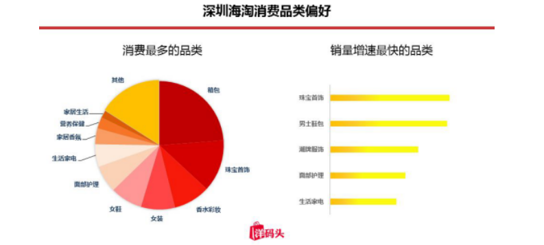 在深圳,选择商品的渠道很多,种类也很多,见多识广的深圳人在海淘时还爱买一些高附加值的商品,比如珠宝首饰和具备收藏价值的箱包。另外男士超前的消费观也在深圳刮起热潮,服饰、鞋、包等快时尚的产物占据深圳人的生活。据洋码头数据显示,深圳人爱买的大牌里包括Prada,Bottega Veneta,Versace等一线大牌,另外还有贵妇级护肤品牌LADUREE,SK-II,Tom Ford等足以印证当地人的消费力。