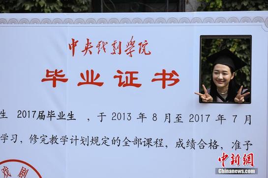 7月5日,中央戏剧学院2017年毕业典礼在北京举行,现场帅哥美女云集。图为毕业生与中戏毕业证书模型合影。中新社记者 崔楠摄