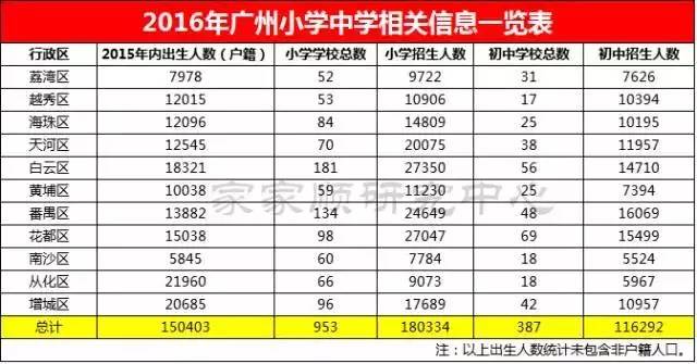 根据广州市教育局公布的数据显示,2016年小学学校 953 所(其中民办155所,其他办学部门798所),实际招生数 180334人。2016年初中中学学校387所,招生数116292人。根据广州教育局规划,到2018年广州将新增16万个公办中小学学位,教育资源较为充分。