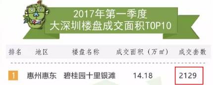 评语:突然杀出的一匹黑马,在2017年第一季度大深圳成交面积榜单中排名第四。而第二季度新一轮推量之后,把历来稳居冠军的碧桂园十里银滩挤到亚军去了。不过由于碧桂园十里银滩面积段比较小,因此成交套数还是略胜一筹。