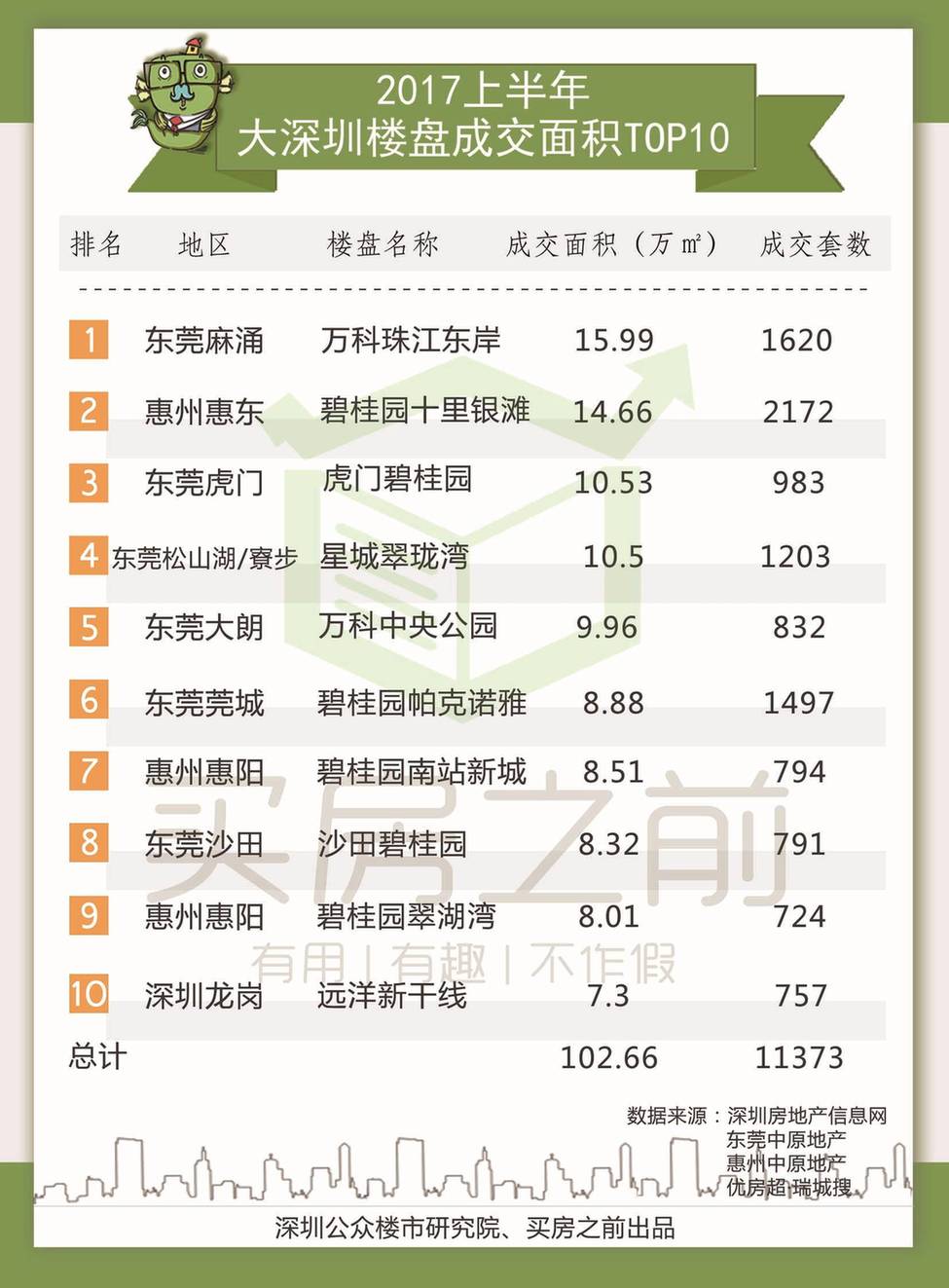 ③由于上半年东莞惠州楼市政策继续加码,深圳依然受去年新政影响,因此整体成交量大幅减少。同比去年上半年的大深圳榜单,前十总成交面积减少了104万平,套数减少了1万套!