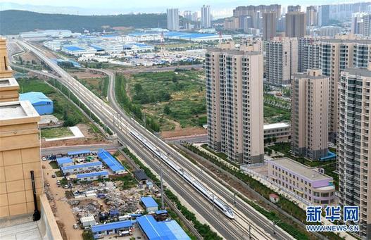 7月9日,西安北开往兰州西的D2651次动车组列车驶过宝鸡市区,这是宝兰高铁开通运营后宝鸡南站发出的首趟开往兰州西方向的高铁动车。 新华社发(唐振江摄)