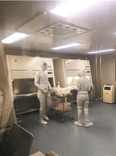合一康“细胞银行”实验室内,工作人员正在做试验。