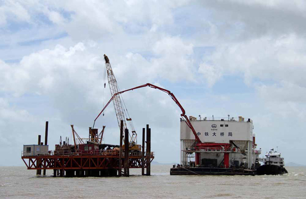 2014年6月15日,CB05标水下基础施工顺利收官的同时,该标段上部结构的承台墩身和组合梁架设也正如火如荼推进。 新华社资料图