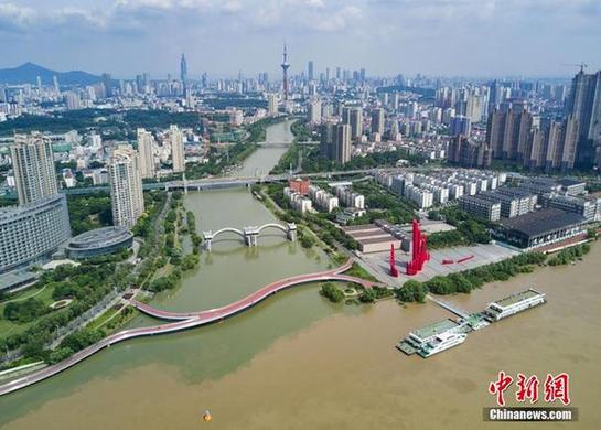 7月10日,航拍长江与南京秦淮河交汇处,江水与河水“泾渭分明”。当日,江苏水利厅发布的水情信息显示,长江南京段水位已降至警戒线以下。中新社记者泱波 摄