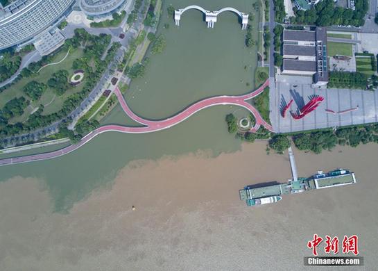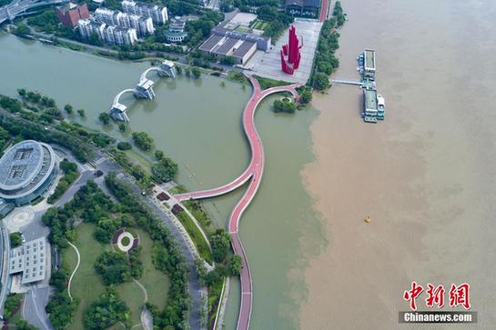 7月10日,航拍长江与南京秦淮河交汇处,树木淹入水中。当日,江苏水利厅发布的水情信息显示,长江南京段水位已降至警戒线以下。中新社记者泱波 摄