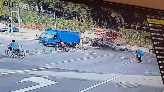监控拍下惊魂一刻:混凝土泵车失控撞小车