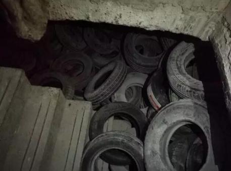 通过小区楼下轮胎店内一个狭窄的楼梯口,低头弯腰进入地下室。在入口附近,堆放着大量轮胎,内部灯光昏暗,空气不畅,十分闷热。