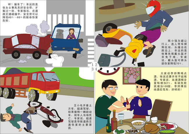 在道路交通碰撞中,安全带可以降低40﹪~50﹪的伤害危险以及40﹪~60﹪的致命伤害危险,佩戴摩托车头盔可将头部伤害及其严重程度降低约70﹪。血液酒精含量每增加2﹪,发生危及生命的道路碰撞事故危险就增加100倍。为了对自己的健康负责,对社会、对家庭负责,开车(或者乘车)时,一定要按照交通法规系安全带(或戴头盔)、不超速、不疲劳驾驶、不酒后驾车。