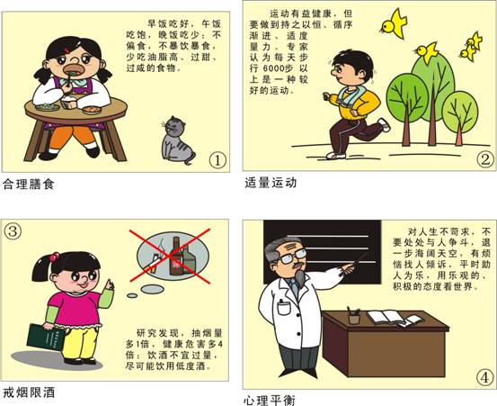 3. 健康生活方式主要包括合理膳食、适量运动、戒烟限酒、心理平衡四个方面。