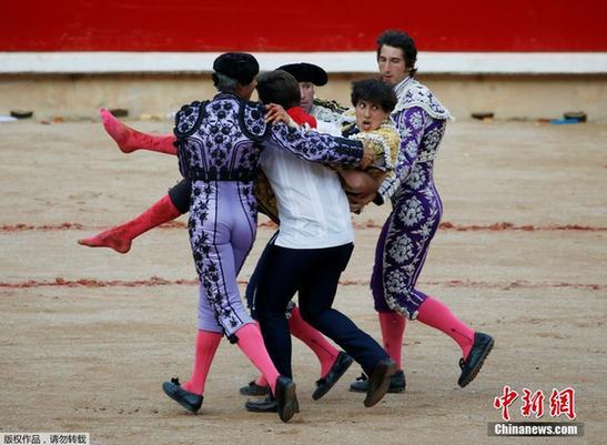 当地时间2017年7月11日,西班牙潘普洛纳,圣佛明节第六天,斗牛活动举行,场面血腥,一斗牛士被公牛顶伤,被抬出场地。
