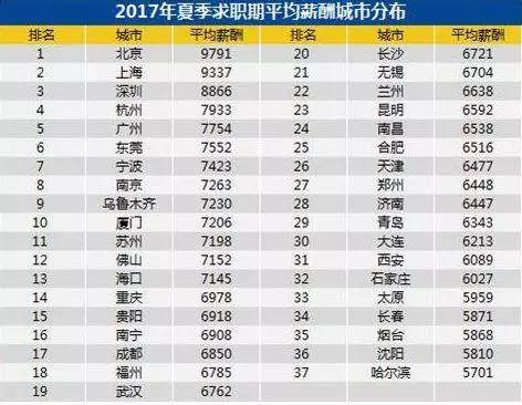 报告显示,2017年夏季求职期,全国37个主要城市的平均招聘月薪为7376元,本季度平均薪酬下降幅度较大,为3.8%。其中,北京的平均薪酬水平依然保持第一名,为9791元。