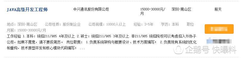 快曝料浏览中兴通讯投放在招聘平台的职位需求,以java高级开发工程师(深圳岗)为例,月薪是1万5到3万元,取中间数年薪27万来算,如果该位工程师在本次奖励名单内,那就代表他一次性拿到近21个月,快2年的工资(不含其它福利补贴)!