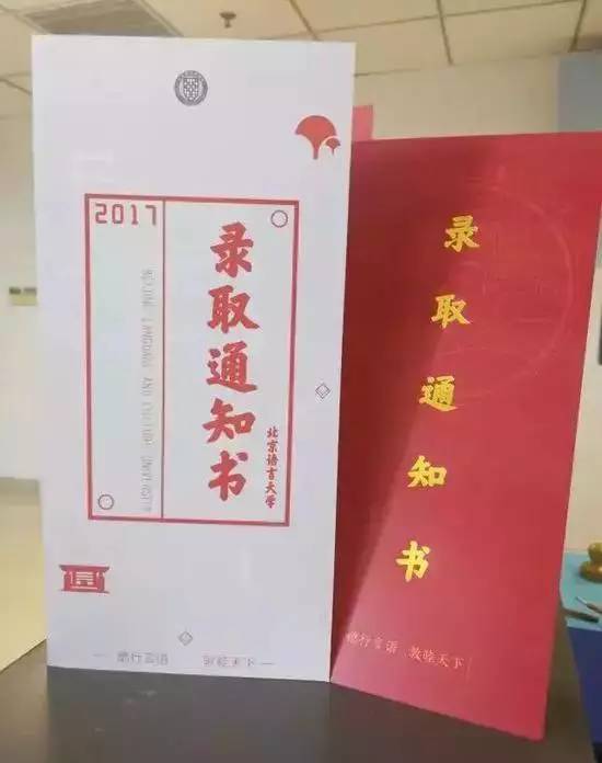 北京语言大学2017年录取通知书两分式的装帧取“云开方见日”的寓意。外封选取橙色作为主色调,代表着北语对新学子大学生活的美好祝愿,成为欢快活泼如橙色般温暖的人,而浅色的底纹则代表了象牙塔的纯洁与学术的清净。