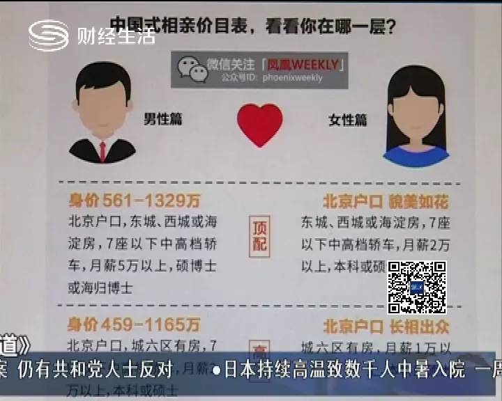 最近,因为一份相亲价目表,大龄适婚群体成为人们关注的焦点。在一些相亲角,着急的父母为不怎么着急的子女奔走,寻找优质的相亲对象,在无法考核人品、性格的前提下,相亲条件就成了选择的标准,户籍、房产、学历、收入、家庭背景等被分解为一项项指标,甚至被明码标价。其中,北京户口估价为54万,中心区或好的学位房估价为1035万,海归博士学历达到150万,再加上90万的车子,一个价值1329万的顶级配置相亲对象就这样新鲜出炉。而在莲花上公园的相亲角,记者发现很多贴出的相亲启示中,虽未对收入、房产等作出要求,但在大爷大妈心里,却依然打着类似的算盘。
