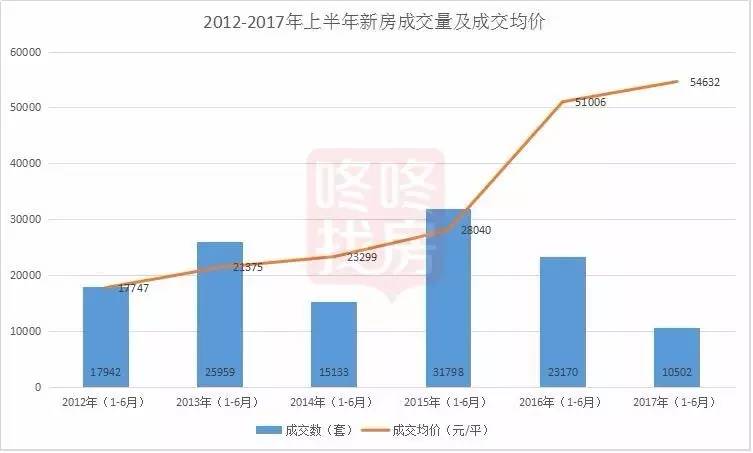 对比近6年深圳上半年新房成交量及成交均价,呈量跌价涨的趋势。成交量是近6年来最低水平,是去年一半不到(占比约45%),仅仅是15年的1/3。