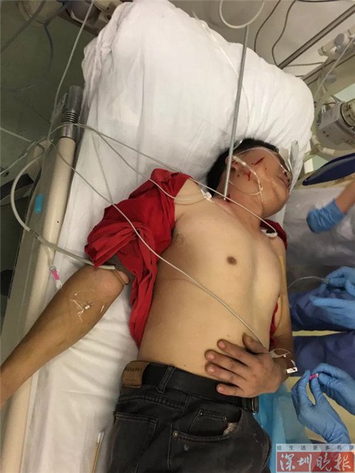 意外发生在7月13日上午10时许,郑先生正在工地上班,没想到飞来横祸,一根6米长2厘米粗的钢筋从十多米高处坠落,正插入他的体内。接到120后,南医大深圳医院院前急救团队火速赶往现场抢救。医院高度关注,廖四照院长赶到急诊科指挥抢救,医教部协调,立即成立由胸外、普外、泌尿外、急诊科、ICU、影像中心、麻醉手术中心、输血科、检验科等组成的重症救治专家组。