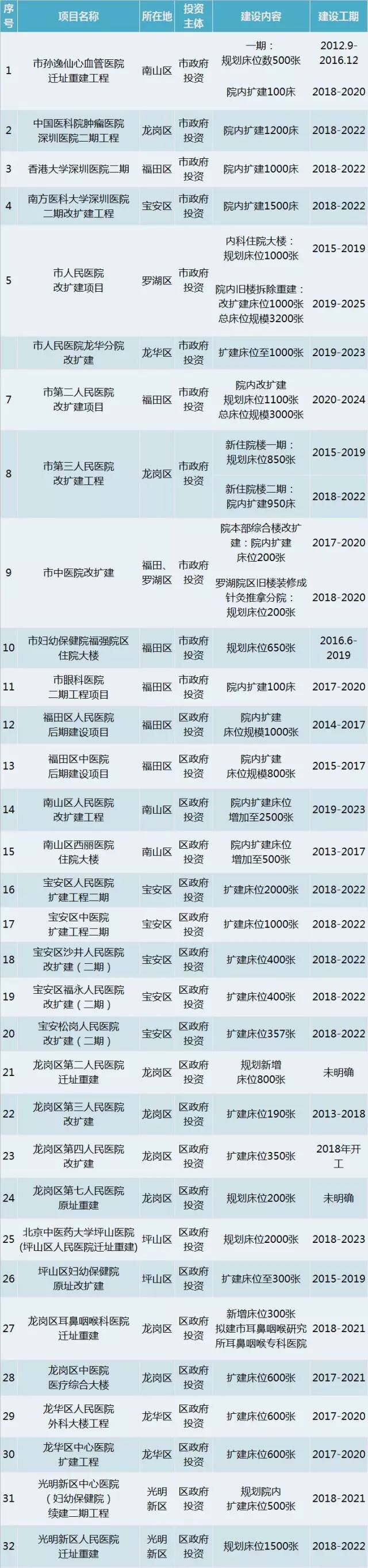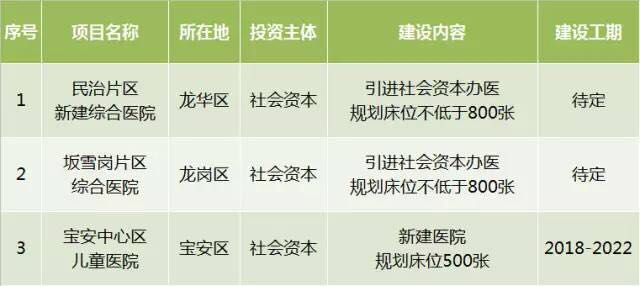 “十三五”期间,政府在医疗卫生的软硬件上加大投入,要把深圳打造成医疗卫生高地。在软件上,深圳加快实施“三名工程”,引进和培育名医(名科)、名院和名诊所(名诊疗中心);努力推进医改,为医务人员创造更好的执业环境,吸引更多人才加盟。在硬件上,深圳计划开展60个医院建设项目,包括新建医院25家,改扩建和迁址重建32家医院,3家社会办新建医院,全部项目完工后,预计可新增床位6万张,使全市总床位数至少达到9.5万张。其中到2020年,计划建设完成2.6万张。