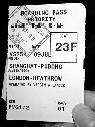 刘女士给北青报记者展示了两个孩子的机票订单和自己孩子的登机牌,显示她的儿子是乘坐7月9日由维珍航空承运的VS251次航班。