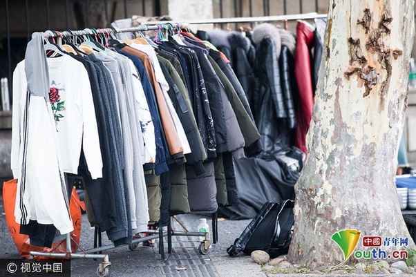 路边放着很多准备拍摄的服装,几乎都是秋冬装,其中还有很多厚厚的羽绒服。一位在附近的停车收费员介绍,这些姑娘们工作很努力,中午大太阳的时候也有人在拍。这份表面光鲜的工作背后,也有很多辛苦。