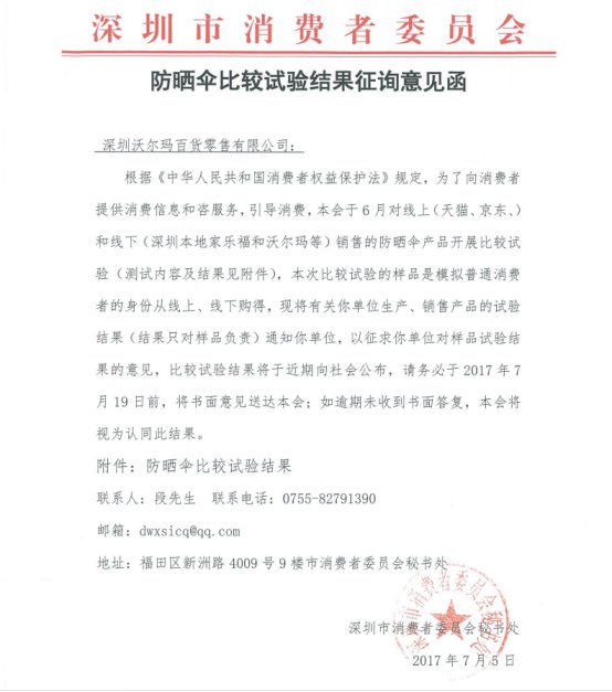 7 月 6 日,深圳市消委会将比较试验结果反馈给商超和网络平台后,深圳乐荣超市有限公司在反馈期限内给出书面正式反馈,并将不符合标准要求的产品进行下架处理;广州晶东贸易有限公司(京东)也对不符合标准要求的产品进行下架处理。7 月 19 日 17 点,市消委会工作人员前往香蜜湖沃尔玛依旧看到不符合标准要求产品,天堂品牌太空之旅防晒伞紫、天堂品牌完美旅行防晒伞红在货架上仍有销售。