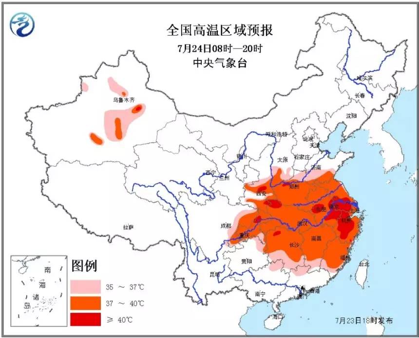 预计,7月24日白天,西北地区东部、黄淮、四川盆地中东部、江汉、江淮、江南、华南北部等地有35℃以上的高温天气。