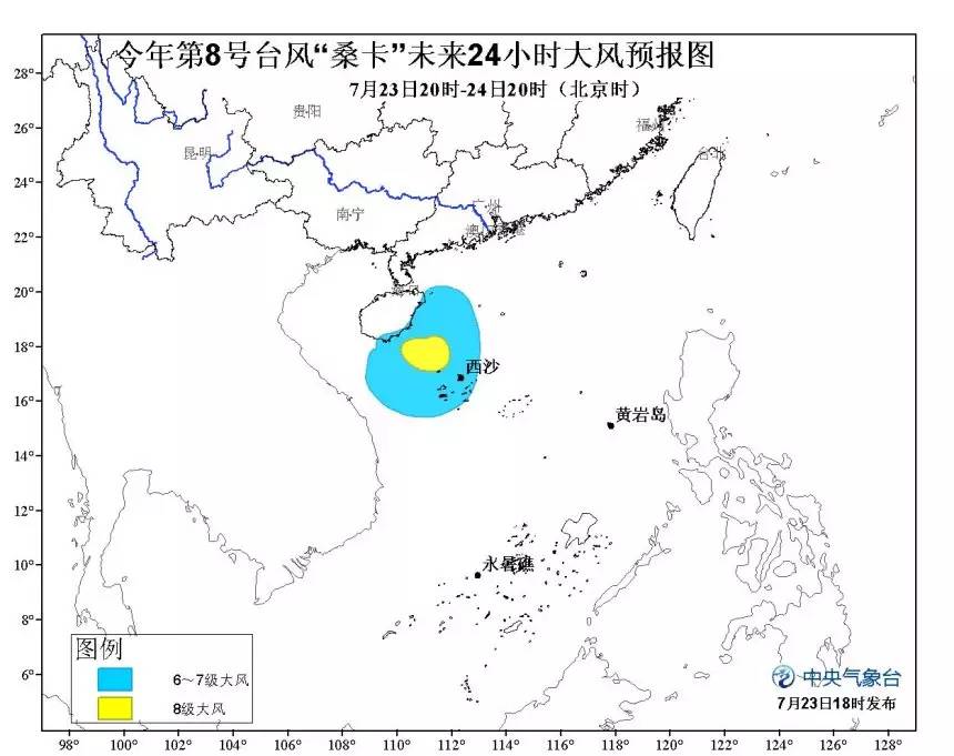 中央气象台7月23日18时继续发布台风蓝色预警:今年第8号台风“桑卡”(热带风暴级,英文名:SONCA;名字来源:越南;名字意义:一种会唱歌的鸟)的中心今天下午6点钟仍位于海南三亚东偏南方约235公里的南海中西部海面上,就是北纬17.4度、东经111.5度,中心附近最大风力有8级(18米/秒),中心最低气压为998百帕,七级风圈半径80公里。