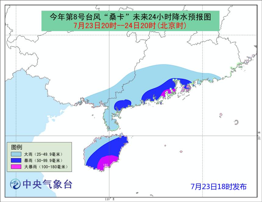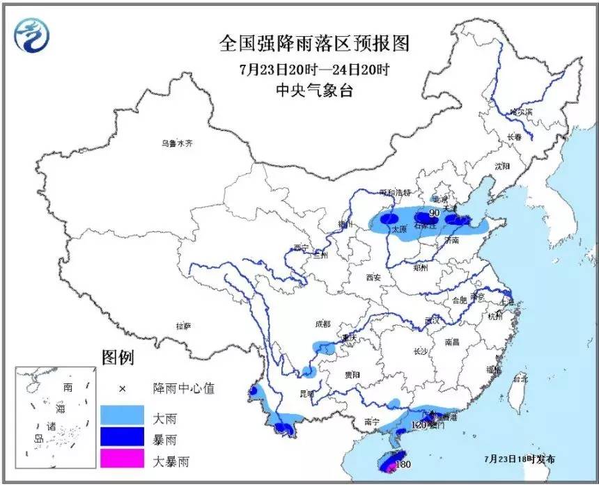 预计7月23日20时至24日20时,陕西北部、山西中北部、北京西南部、河北中南部、天津南部、山东北部、广东南部、广西南部沿海、海南岛、四川盆地南部、云南西部等地的部分地区有大雨或暴雨,其中,广东珠江口附近、海南岛东南部等地局地有大暴雨(100~180毫米);上述部分地区有短时强降水,局地伴有雷暴大风等强对流天气,最大小时雨强可达20~50毫米,局地超过70毫米。