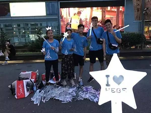 7月15日傍晚,王泽斌(右一)和队友在演唱会前卖应援物。浙江师范大学行知学院 供图