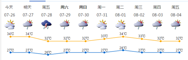 我市多云,局地有短时小雨;气温27-34℃;东南风2-3级;相对湿度60%-90%